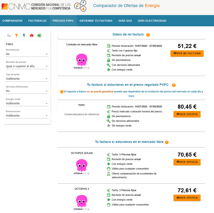Resulta llamativo que las tres ofertas más baratas con mi consumo, sean todas de Octopus Energy.