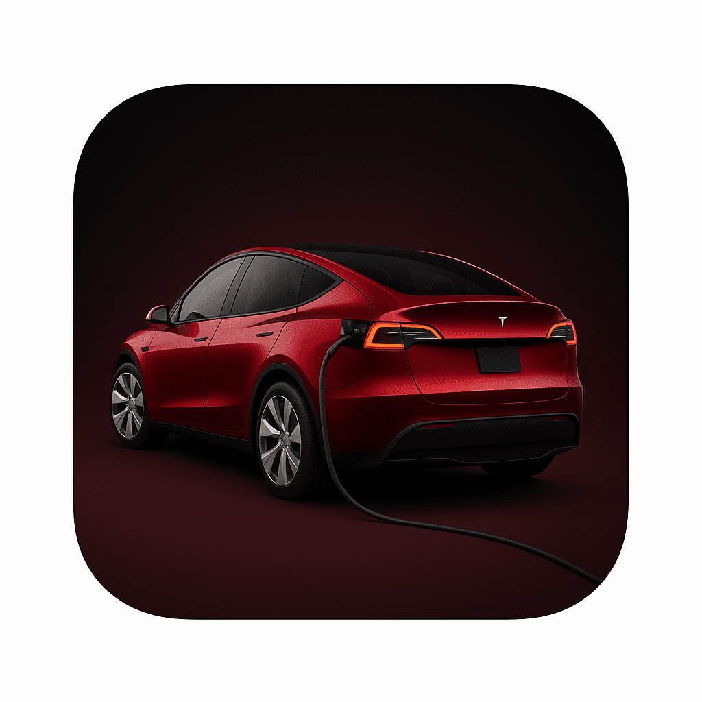 Tesla Model Y in {COLOR}, three-quarter rear view, charge port door open with green charging cable connected, subtle dark-to-red gradient background, studio lighting, 4K, rounded-square composition