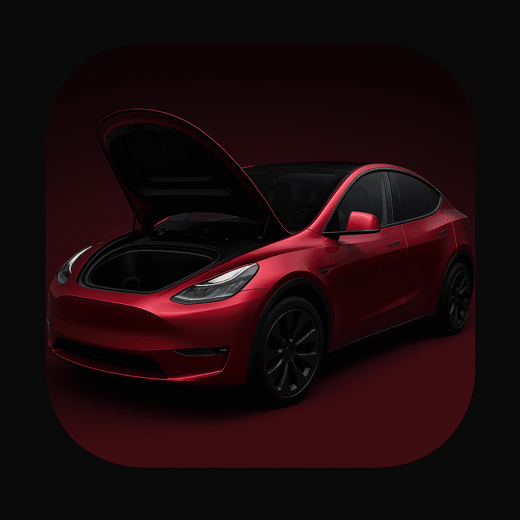 A sleek Tesla Model Y in {COLOR}, three-quarter front view, frunk open, subtle dark-to-red gradient background, studio lighting, highly detailed, 4K, rounded-square composition - Maletero trasero abierto: